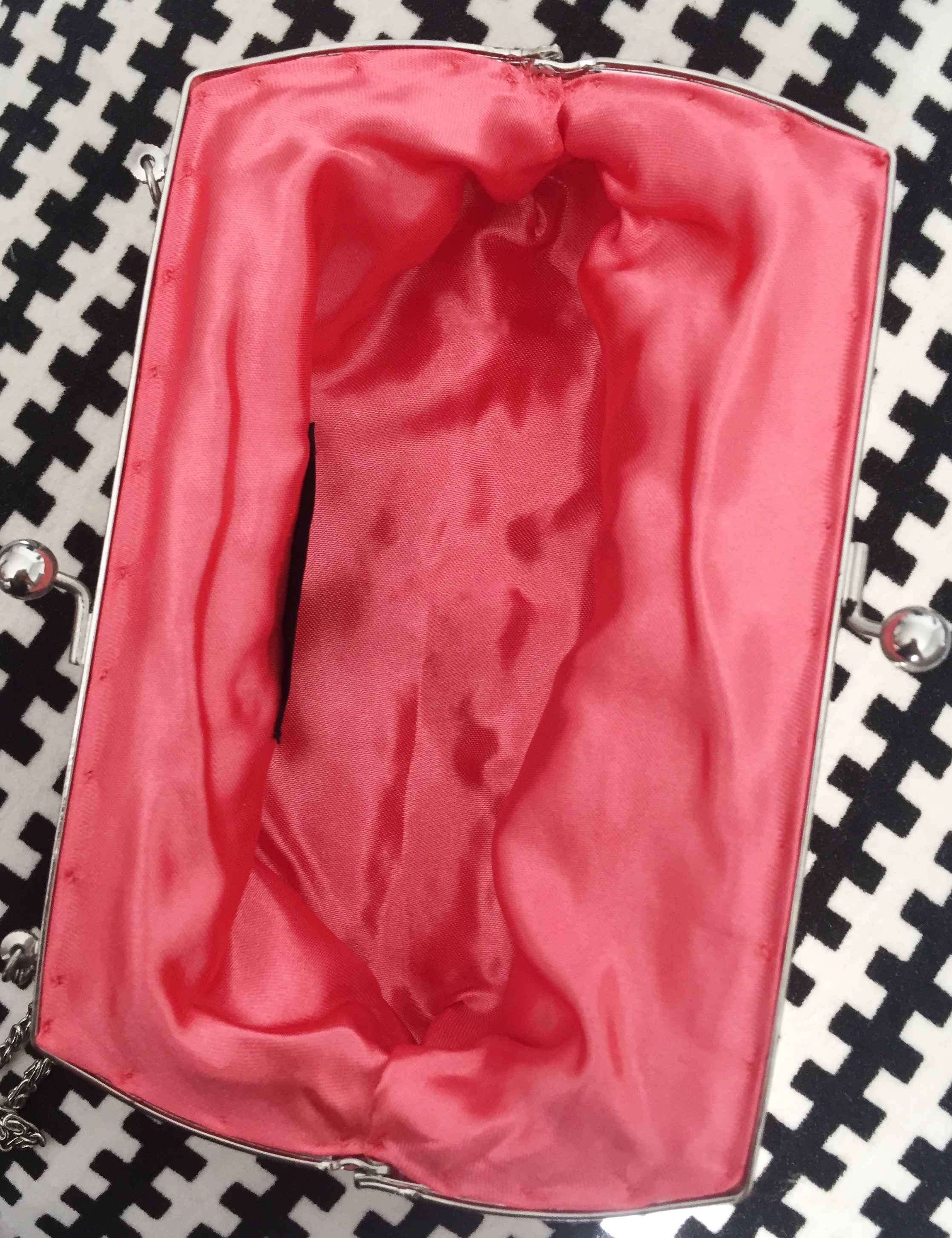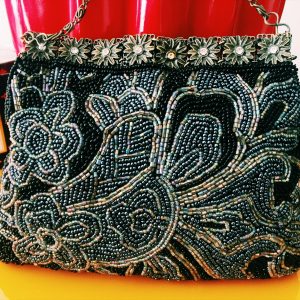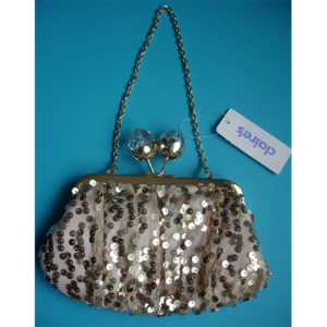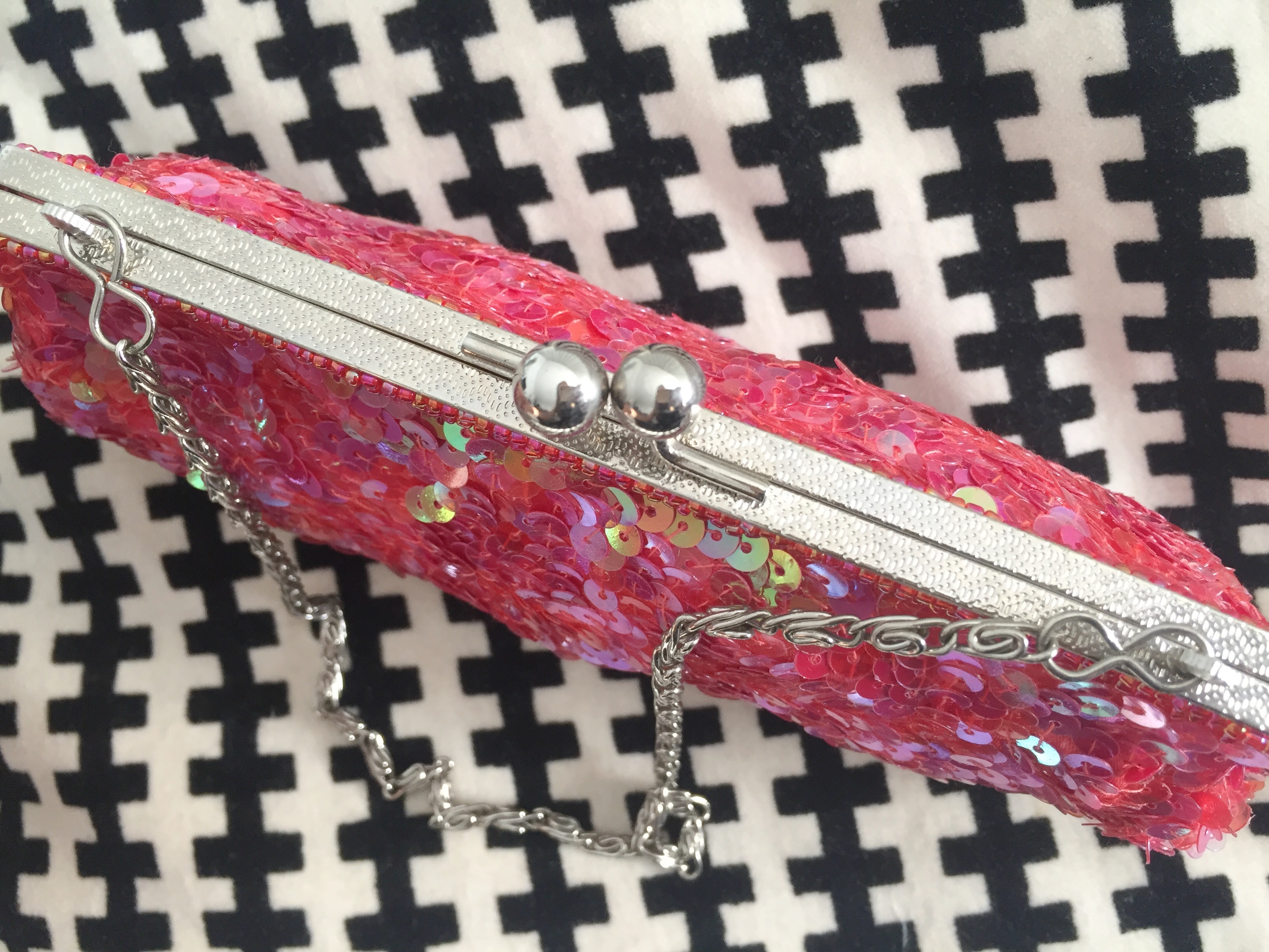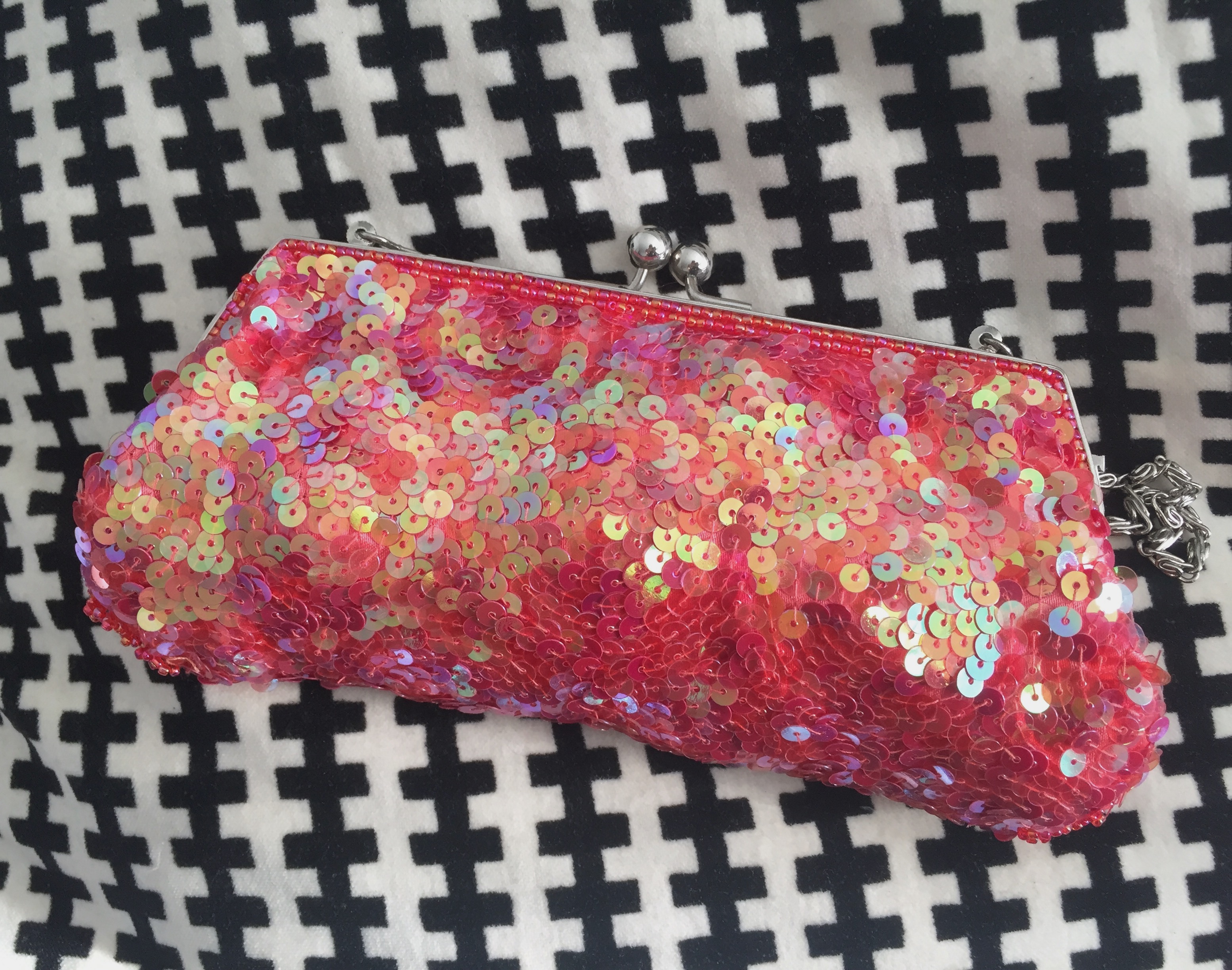 Mala de cerimónia com aplicações de lantejoulas em tons de rosa.