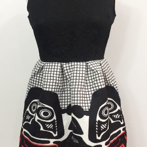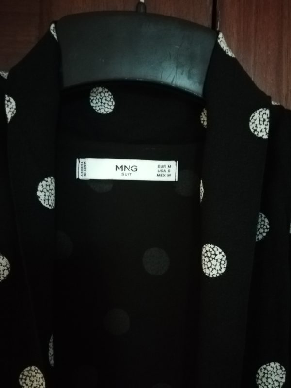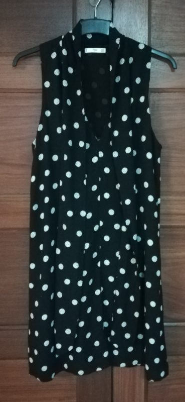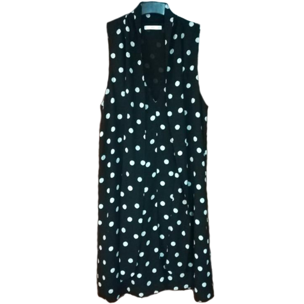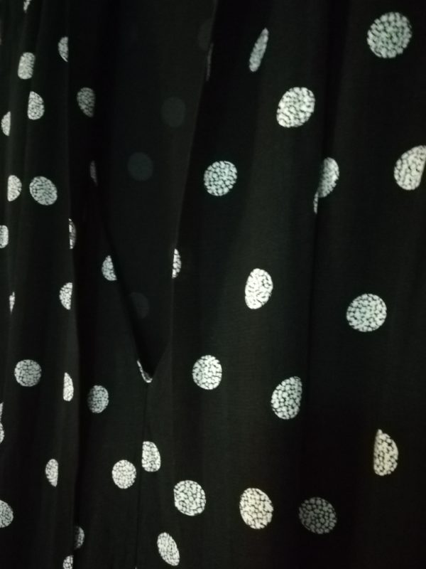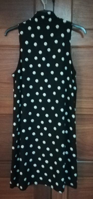 Vestido com toque suave, decote em V com laçada. Preto e branco.